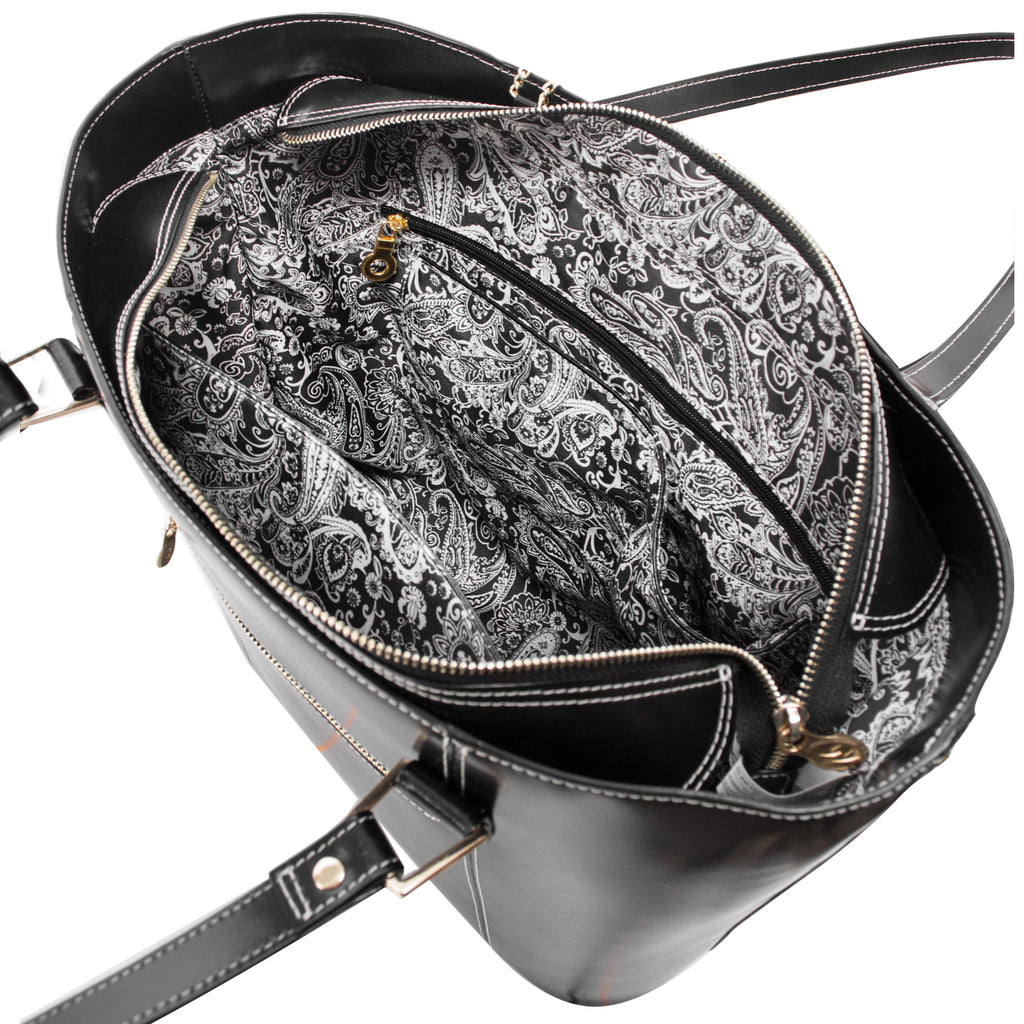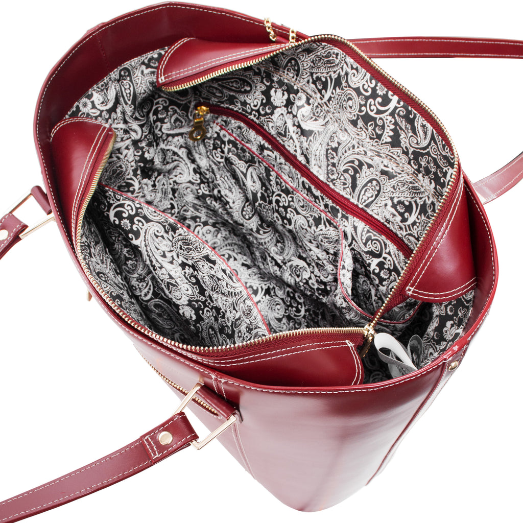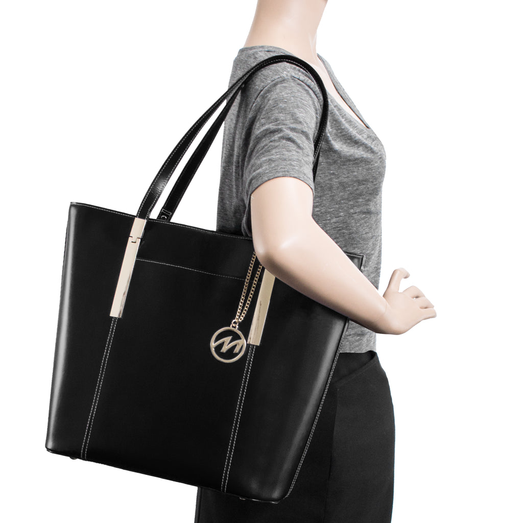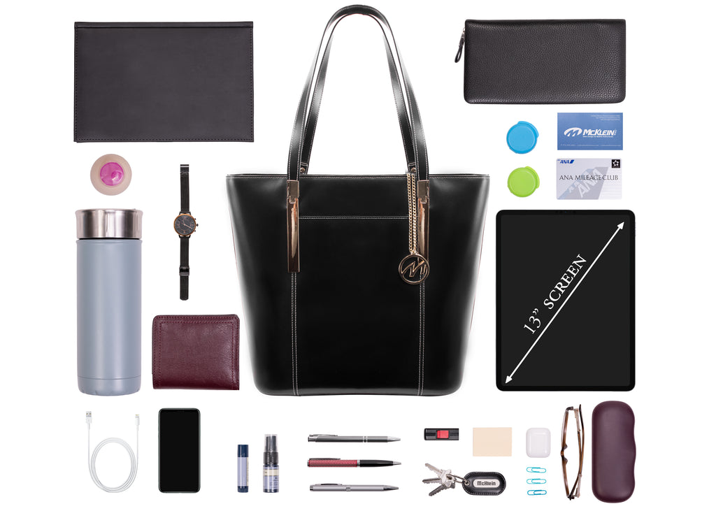 Deva is the tote that perfectly balances professionalism and personal style. Crafted from premium full-grain leather, this tote offers ample space for both your work essentials and personal items. With its thoughtful organization, including a tablet pocket, interior slip pockets, and a back zipper pocket, Deva ensures that you stay organized and chic wherever you go. Add the finishing touch with the McKlein emblem gold key chain, elevating your style effortlessly.